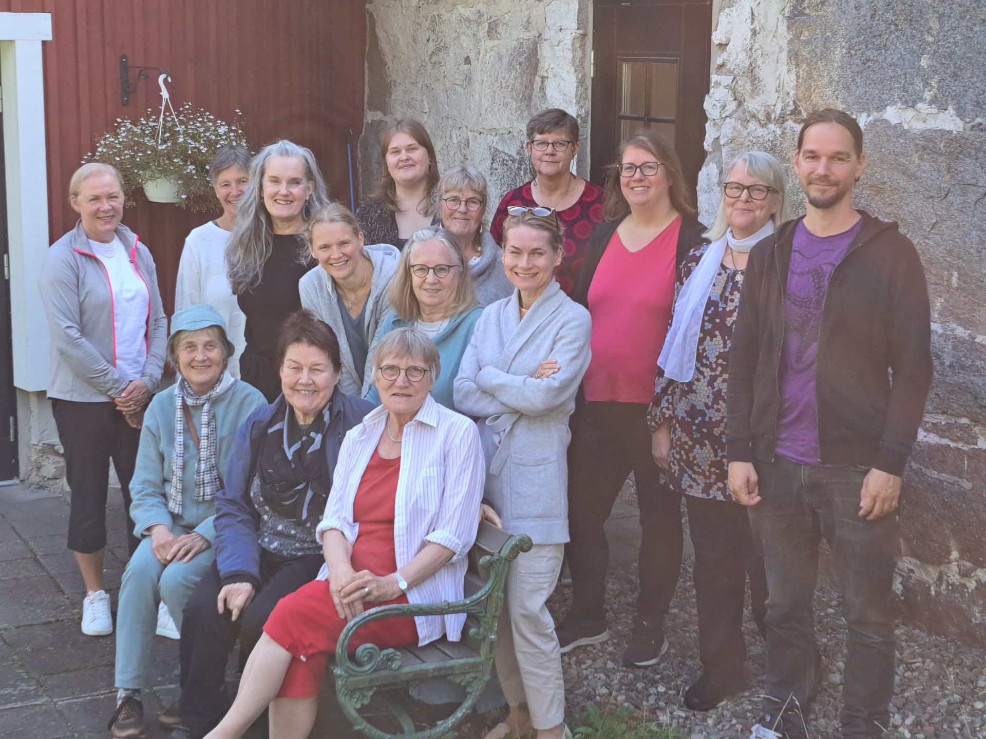 Från vänster Mai Palmberg. Britt-Mari Fredriksson, Kristina Norrgård, Rasmus Tiainen sitter på trappan, ovanför står Henrik Jansson, Stefan Lindkvist, framför honom Liisa Manelius. Lilian Mendelin längst och högst till höger, Amie Nygrén framför Lilian. En deltagare fattas på denna bild: Christa Nordlund-Hiltunen. Se dock nedan.